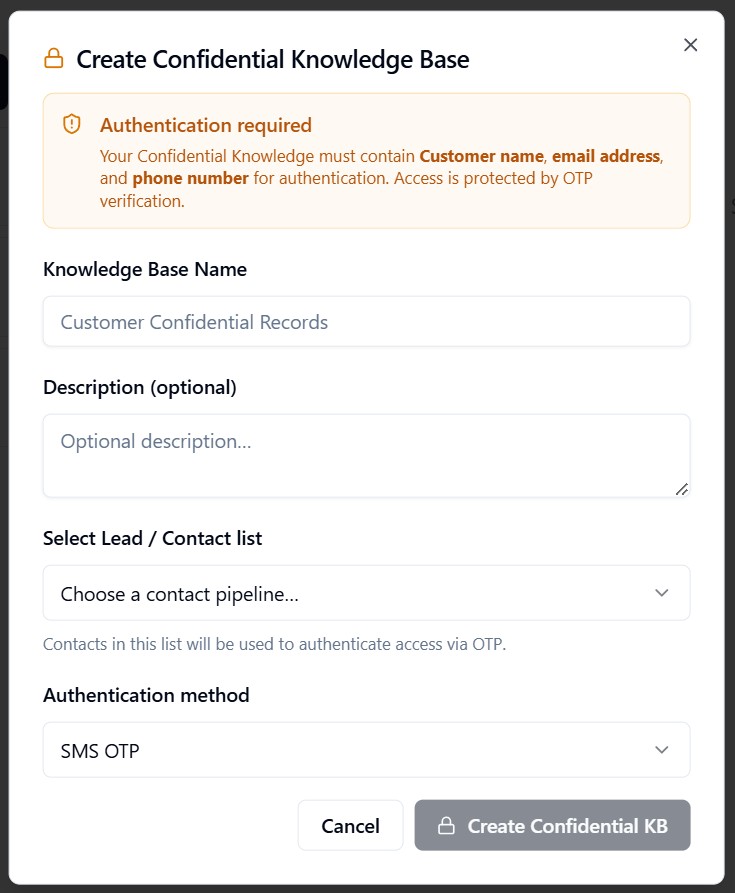 The Amernet Confidential Knowledge Base provides a secure environment for storing and accessing sensitive customer information. Before any confidential data is displayed, users must verify their identity using their name, email address, and phone number, followed by a one-time password (OTP) sent via SMS. This verification process ensures that only authorized individuals can securely access private records.